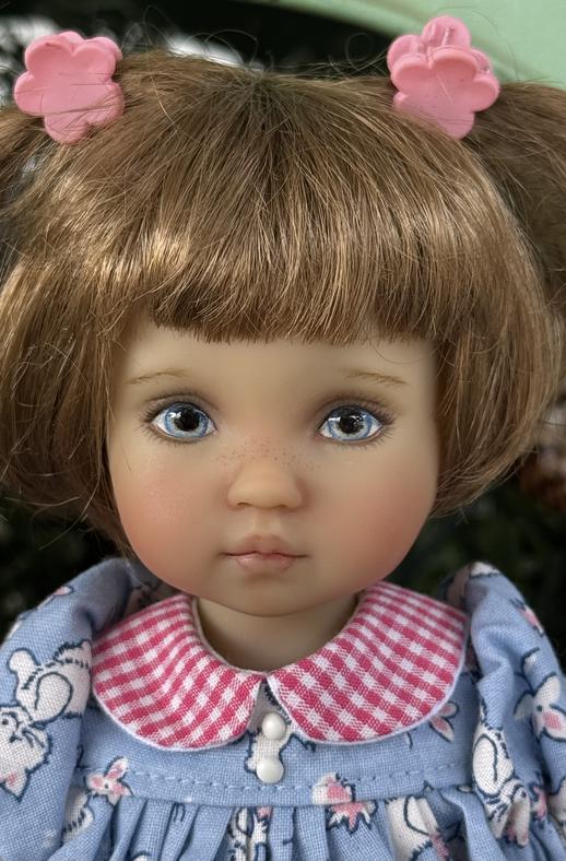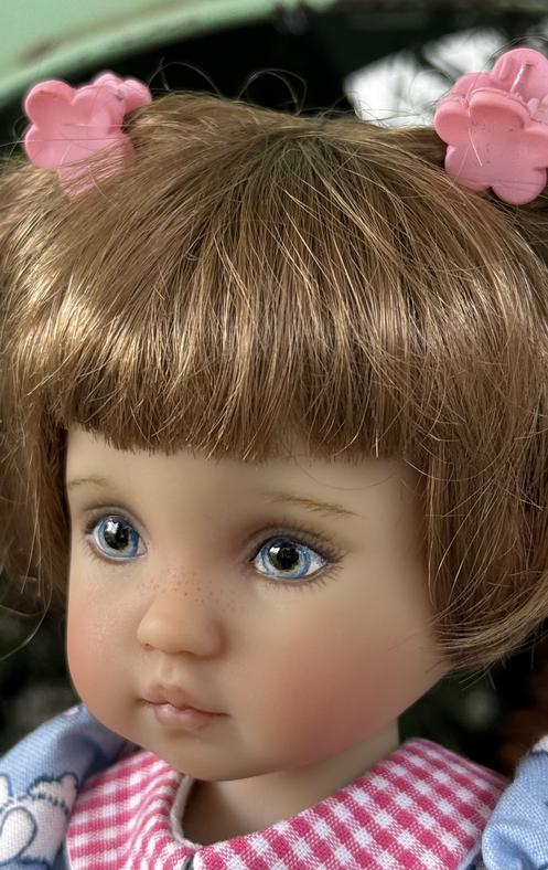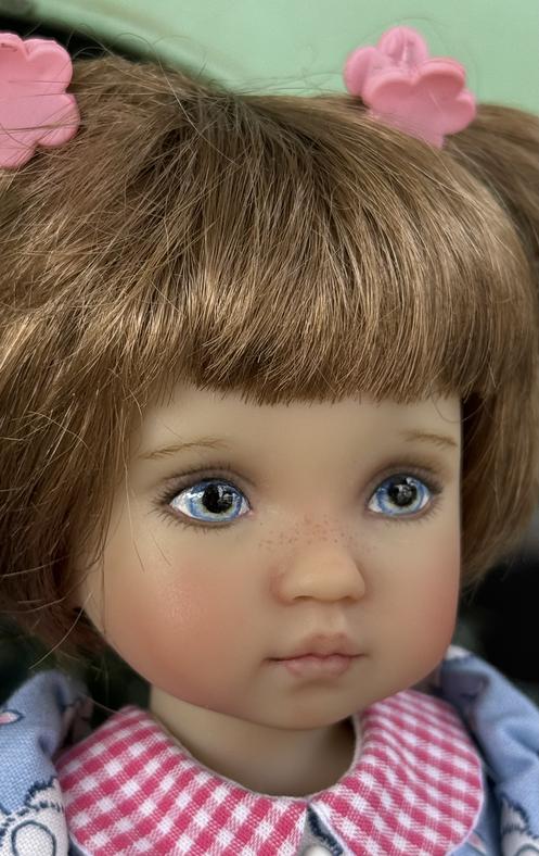 Frankie is a Little Darling # 2 in medium skin tone. She has beautiful hazel green eyes, delicate auburn brows and lashes and an adorable scattering of pretty little freckles across her nose and cheeks .