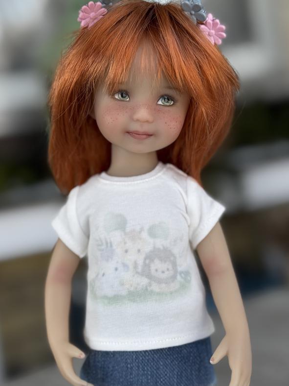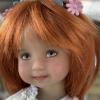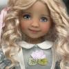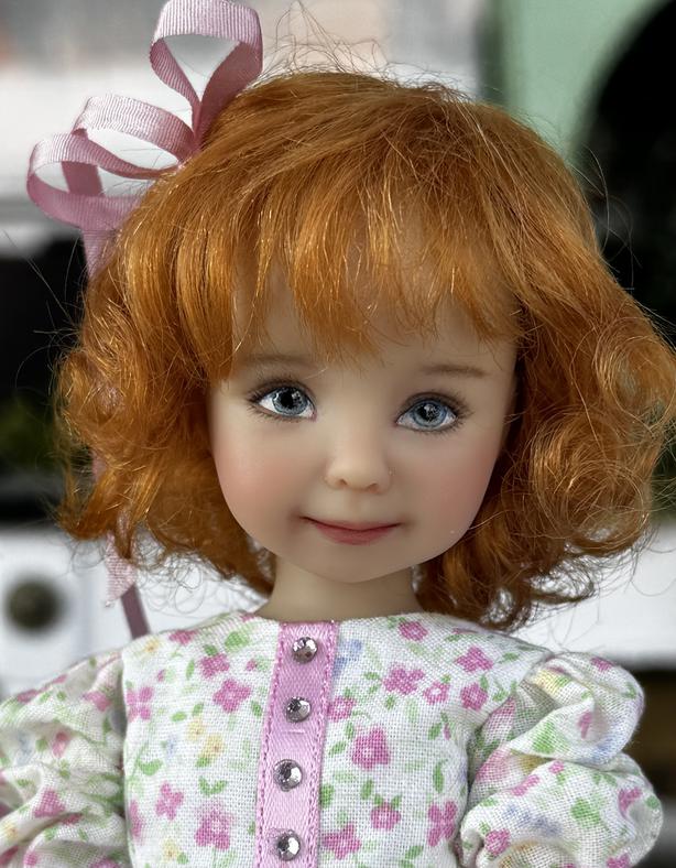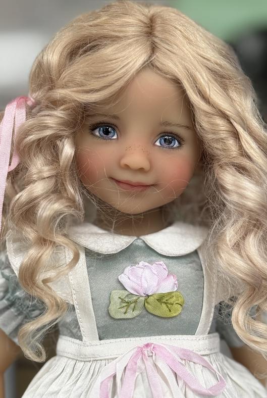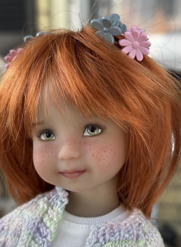 Felicity is a Little Darling #5 in medium skin tone. She has sparkling blue eyes with hints of brown, delicate brows and lashes. They are striking against her reddish brown waves created by Nina Puppenfee.