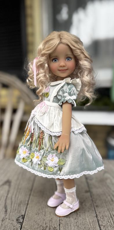 Maisy has a new look! She wanted to be in a Toli Shishkovvdressas well! She chose an amazing dress that reminds me of a Monet painting of water lilies. The the colour of the silk in her dress reminds me of a pond. Embroidered on it are the most beautiful water lilies and appears to be bull rushes. I just love this book. On her head, she decided on a longer hair look with wind ringlets . Maisy is also available in just her scivvies and a synthetic wig if you prefer for $675.00