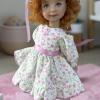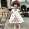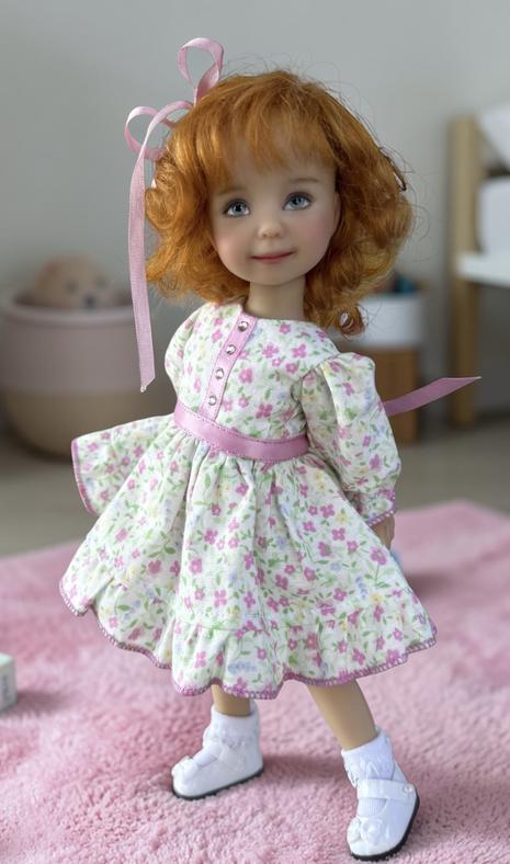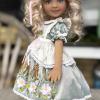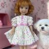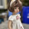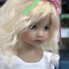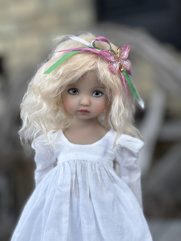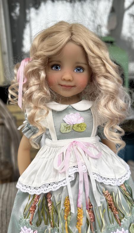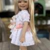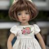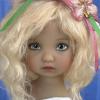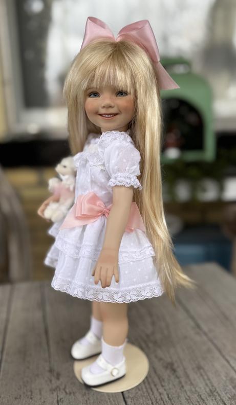 Lydia wears a very sweet party dress created by very talented Fran Patricia Smiles. Her synthetic curls are topped with a white ribbon bow. On her feet she wears white shoes and socks . She will come with a sun, kissed blonde wig, as well as the dark one.