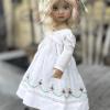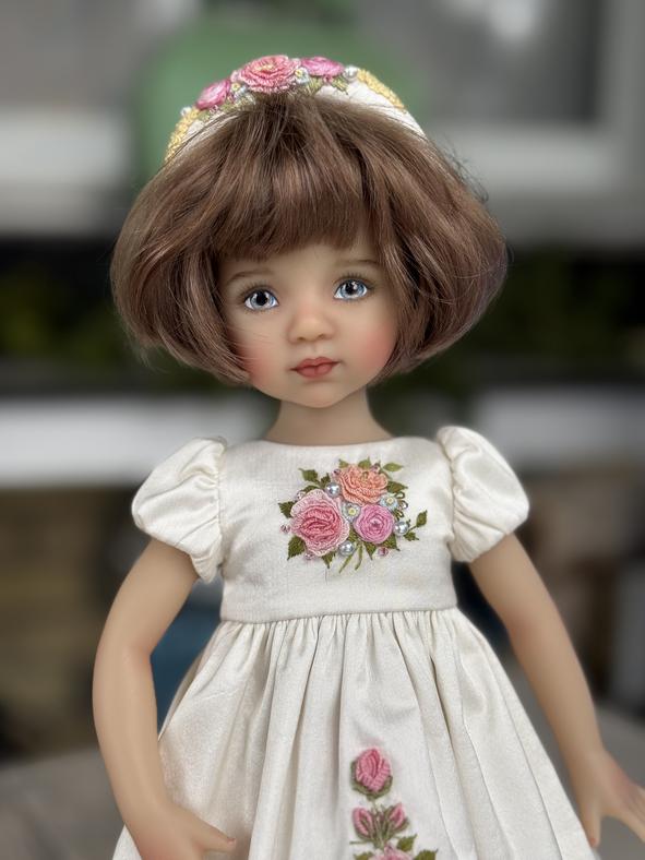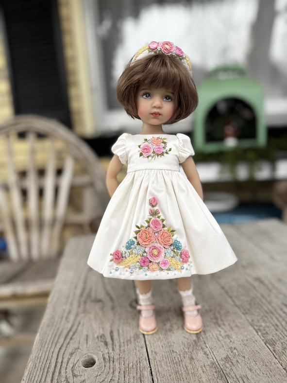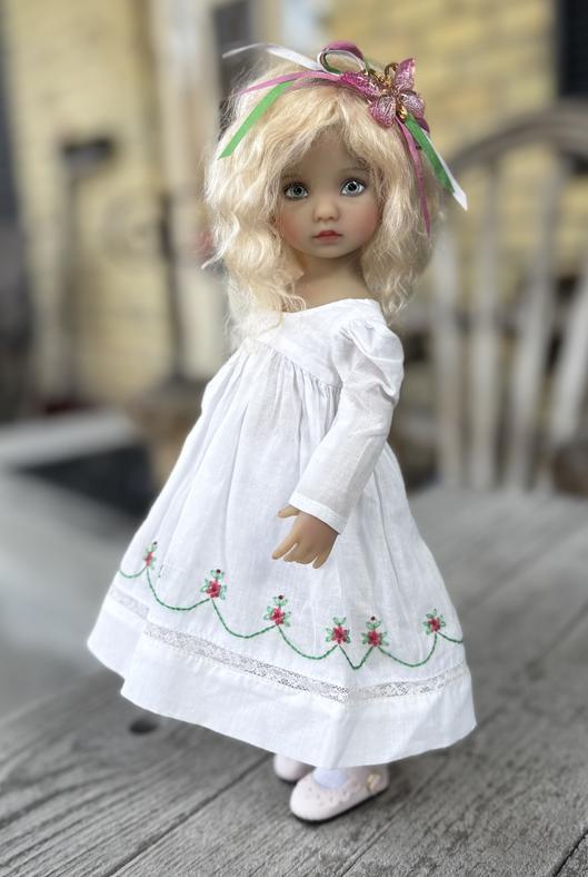 Dani is wearing an adorable Swiss dot cotton dress with a layered skirt. Each tier is edged with heirloom lace. It has sweet puffed sleeves, a ruched bodice and more lace trim. A Pink satin ribbon sits neatly at her waist. Dani also has a matching pink satin hair bow that pins into her long soft hair.