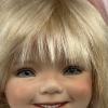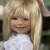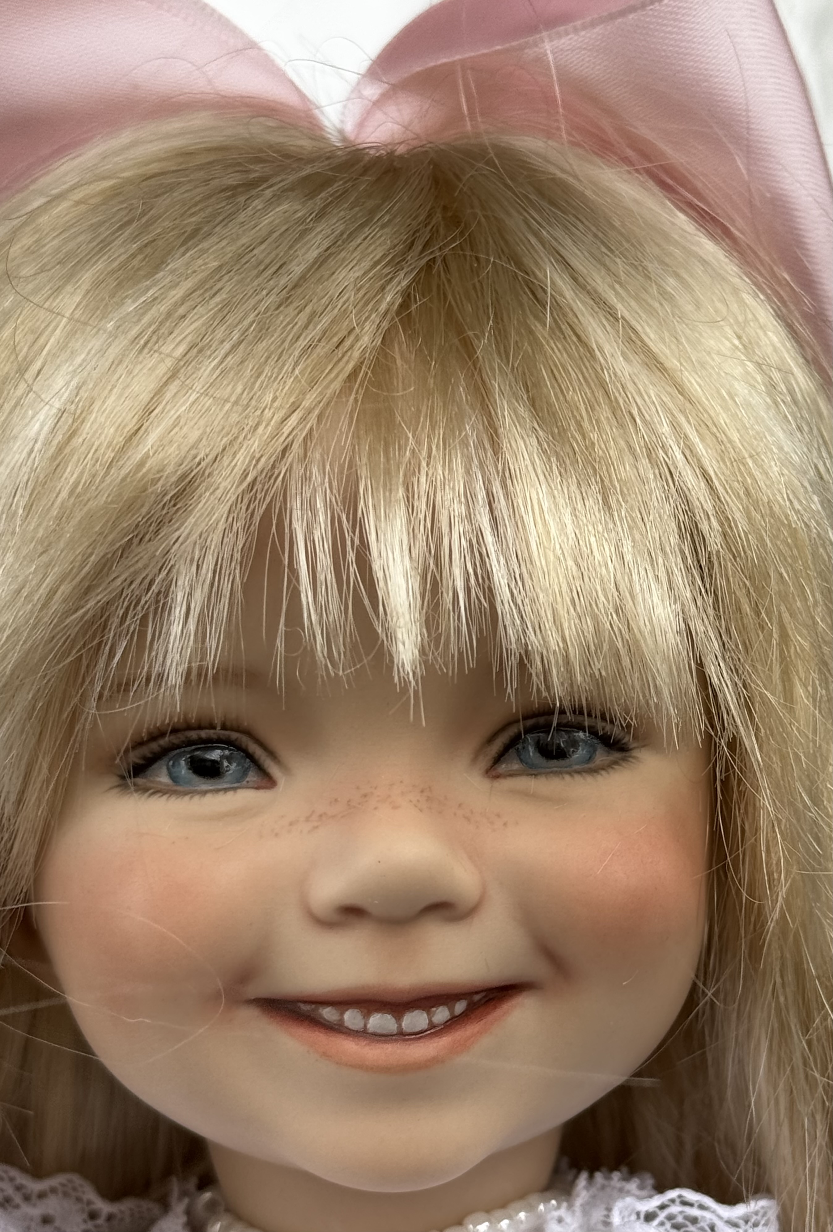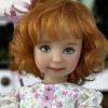 Bernadette has been painted by me with fine china paints withseveral firings to produce her beautiful deep blue eyes , delicate brows and lashes and pretty mouth. She also has a generous spattering of freckles. The whole body has been blushed and all the right spots. I can glaze the eyes on request; the shine they have now is from the numerous firings that were . Bernadette wears a lovely cotton dress with smocking made for me by my friend Kathy.