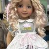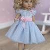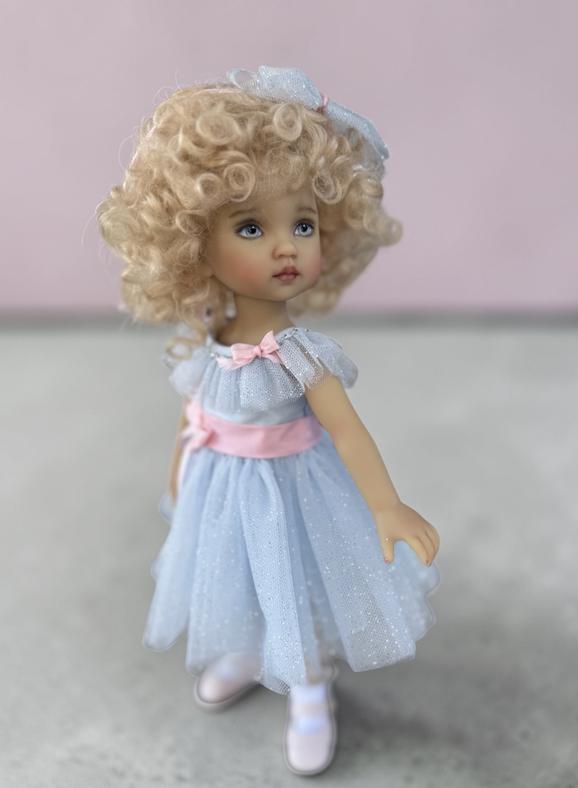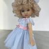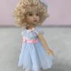 Skye wears an enchanting little frock created by Maritza Moran. With layers of blue twinkle tulle over a full cotton skirt and tulle ruffles around the collar it’s a perfect fit! It is trimmed and tiny little glass, beads, and pink silk ribbon. What little girl wouldn’t have wanted a beautiful party dress like this?. Skye also has a matching hair bow that ties into her extraordinarily soft hair curls with a pink silk ribbon.